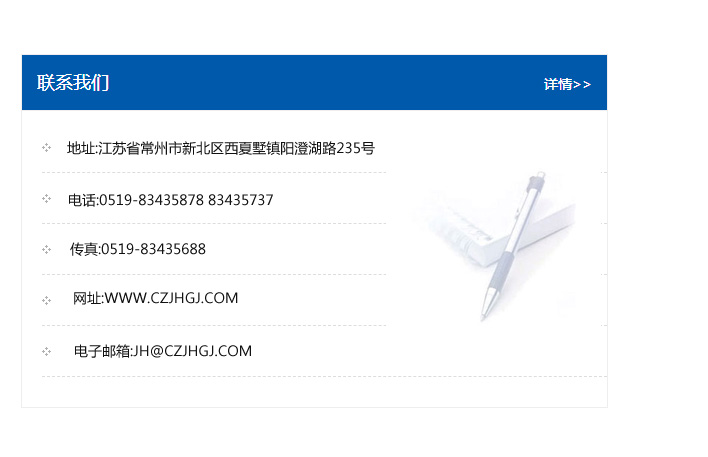 地址:常州市新北區友邦商務大廈1幢16、17層  電話:0519-85101652  傳真:0519-85112595  郵編:213022  網址:www.cz-jiayue_cn.cqdyls.com  郵箱:xiajifengaa@163.com